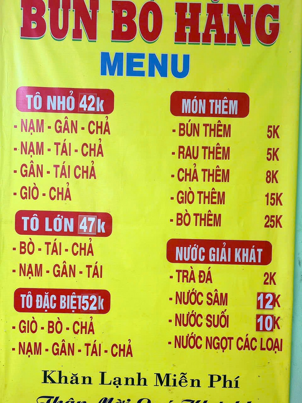 Húp một ít nước beo béo đậm đà, bạn sẽ cùng lúc cảm nhận vị cay, vị đậm đà, vừa nóng, vừa xuýt xoa, vừa nghe vị ngọt của nước bún, của thịt chạy dần vào trong thực quản. Tại Bún Bò Hằng, bạn nhiều lựa chọn với bún bò Huế, chẳng hạn như bún bò - giò nạc, bún bò - giò gân, bún bò - giò chả, bún bò - bò bắp, bún bò - bò tái, bún bò - chả cua, bún bò - chả Huế…