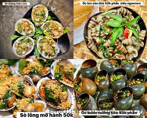 Điểm thu hút lớn nhất của quán chính là thực đơn đa dạng với nhiều loại hải sản tươi ngon như ốc hương, ốc len, sò điệp, nghêu hay sò lông. Mỗi món ăn đều được chế biến theo nhiều cách khác nhau như xào me, xào tỏi, rang muối hay nướng mỡ hành, mang đến hương vị đậm đà, hấp dẫn.