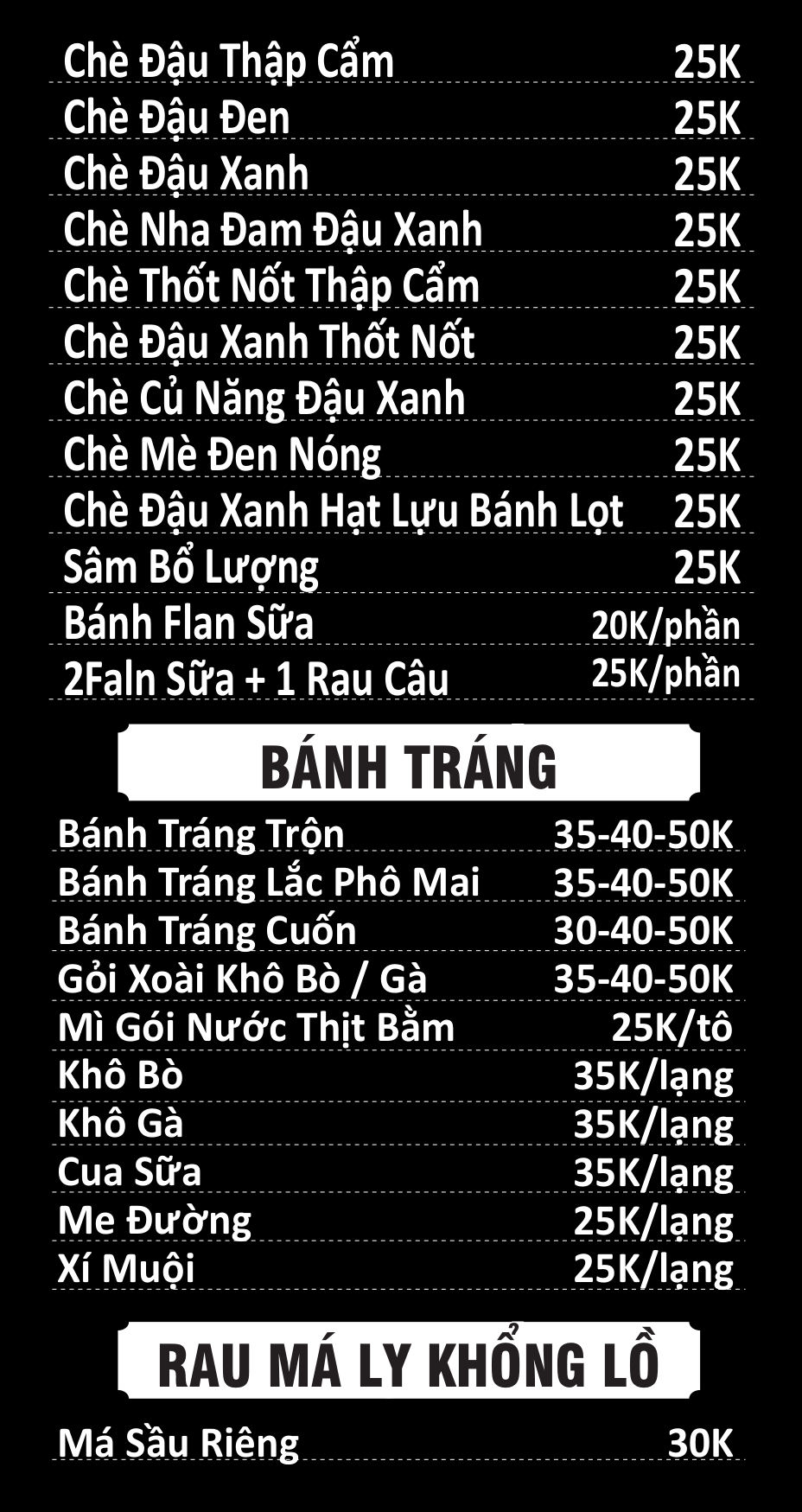 Không những vậy, quán còn đem đến cho bạn một số lựa chọn khác như Bánh flan, Bánh tráng trộn, Gỏi xoài. Vừa được ăn ngon vừa được uống ngon thì quả là tiện lợi rồi phải không nè.